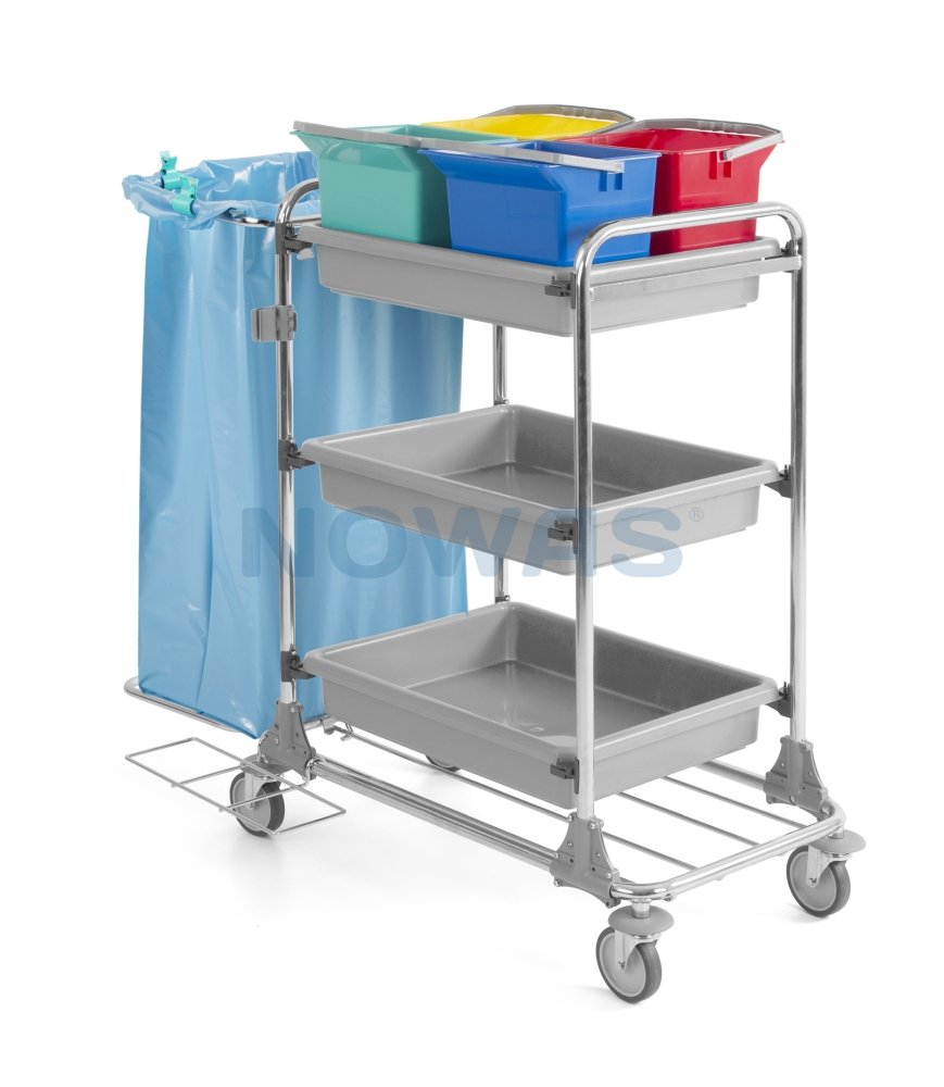 Trolley Tecno 96 with bag holder, 3 trays, 4x6L buckets.