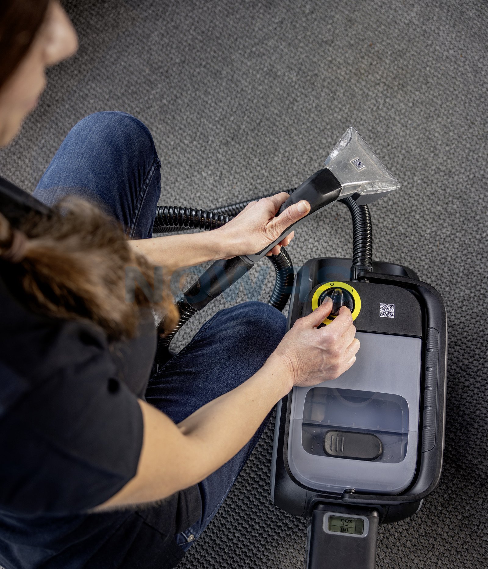 Robust, durable and powerful with cordless flexibility: the Kärcher Puzzi 2/1 Bp battery-powered spray extraction cleaner.