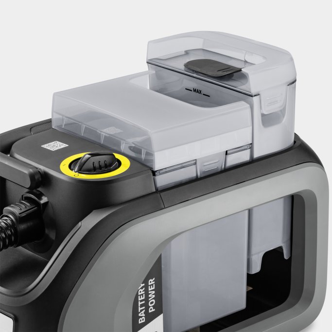 Thanks to its compact design, low weight and ergonomic carrying handle, the machine is easy to carry one-handed. For the best stain removal results, the cleaning solution is pressurised and sprayed deep into the textile fibres before being vacuumed back up together with the loosened dirt. Supplied as standard: upholstery nozzle, spray/suction hose, separate containers for fresh and dirty water and integrated accessory storage. When ordering this machine version, please bear in mind that the powerful 36 V Kärcher Battery Power+ battery and the corresponding fast charger must be ordered separately.