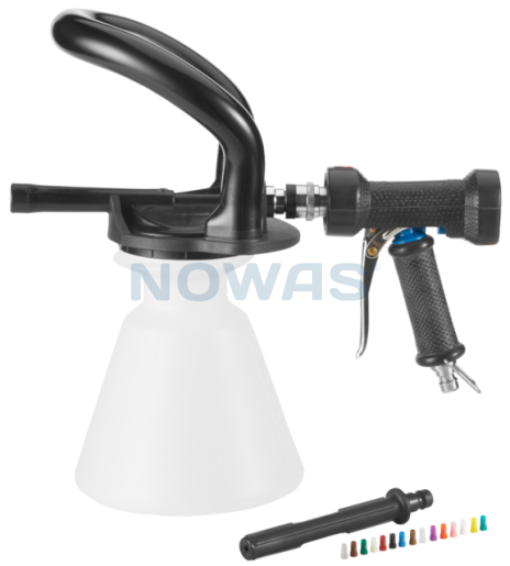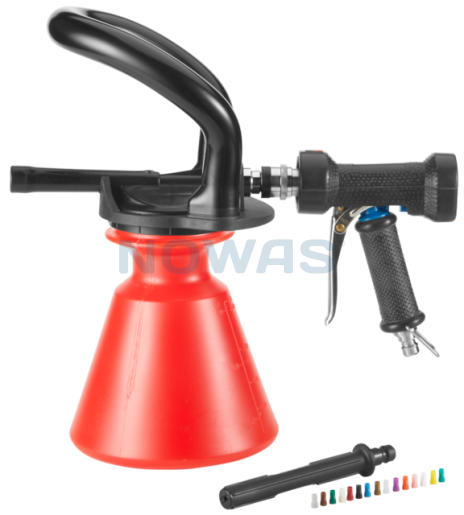 Easily tackle large-scale cleaning tasks with the Foaming Set. Whether youre cleaning walls in a food processing environment or washing the floors in showers, fitness studios, pools, or more, the Foaming Set gets the job done with a constant chemical dosage (0.4-10%, depending on manufacturers recommendations). It can handle 8 bars of pressure and has an ergonomic grip that wont slip, even when wet. Each version comes in 5 colours and has a set of 15 colour-coded nozzles for different chemical concentrations. Never allow chemicals directly through the foaming gun.