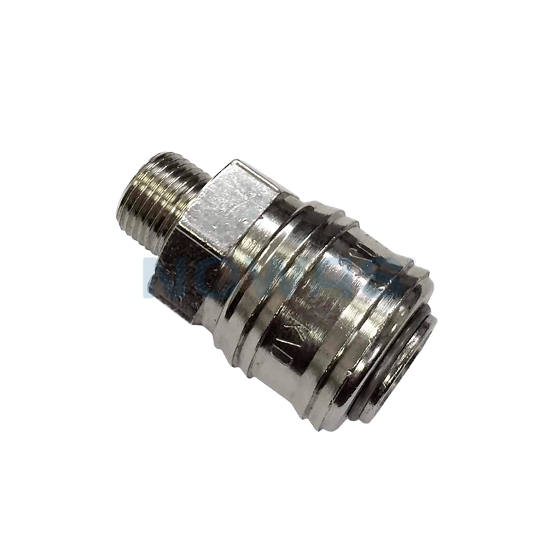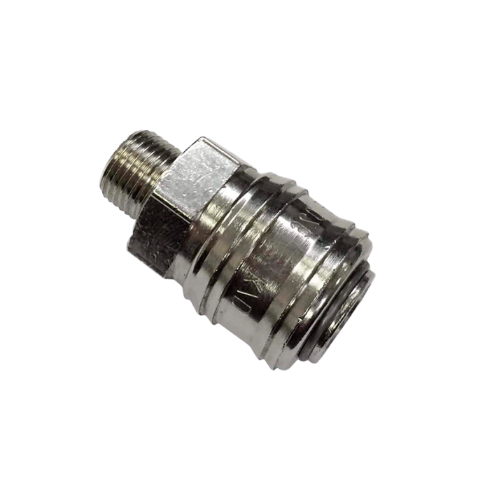 This female coupling is made of nickel-plated brass and features a 1/4" external thread.