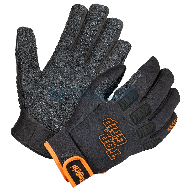 Durable and robust work glove from JokaSafe TopGrip 5510, made of water-repellent neoprene, suitable for both recreational and professional use. The special granulated TopGrip® material covers the entire palm, providing excellent and secure grip. The back of the glove features a skeletal structure that protects the fingers from impact. These gloves are well-suited for various outdoor tasks, warehouse work, and lifting jobs where a firm grip is essential. The gloves are fastened securely to the hands with Velcro straps.