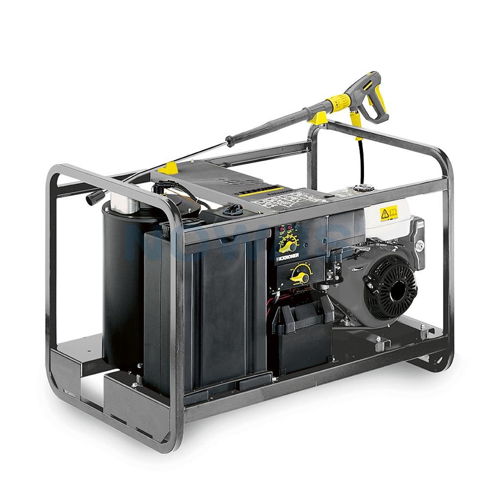 Petrol-fuelled hot-water high-pressure cleaner with float tank, anti-scale protection, fuel shortage safeguard, steam level and infinitely variable pressure and water flow rate. Detergent mixture at high pressure. Electric and manual start.