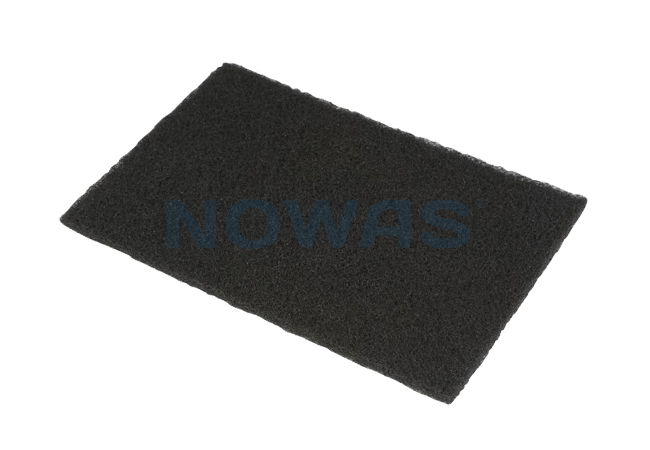 Black scouring nylon, which is hard in terms of quality in relation to roughness. Scouring nylon is used for scrubbing floors and other hard surfaces, as well as for removing limescale from tiles. This type of hand-scouring nylon is flexible and can therefore more easily get into all corners where floor treatment machines cannot reach.