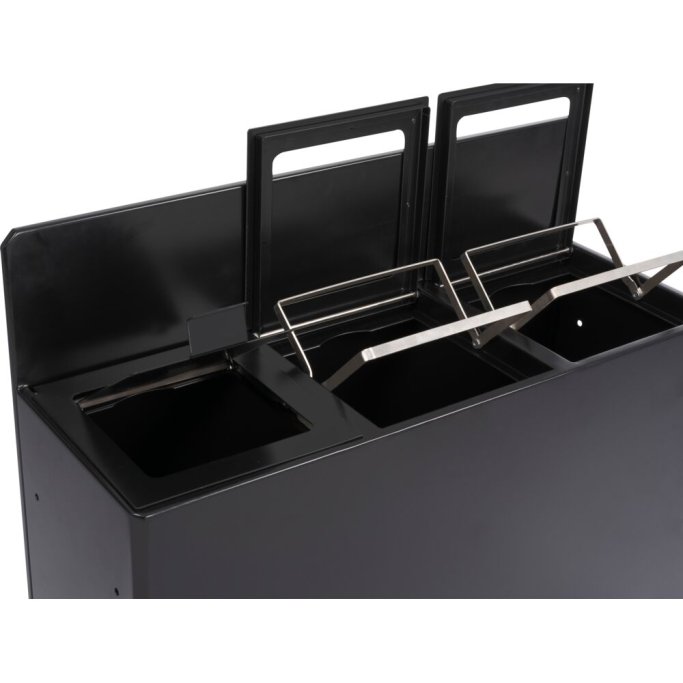 The waste bins feature an integrated top panel that conceals the bag holders. When replacing bags, the top panel can be opened and locked in an open position using magnets in the back panel, making bag replacement quick and efficient. To minimize unwanted odors - for example from food waste - one of the compartments is equipped with a lid. The lid can easily be removed if desired.