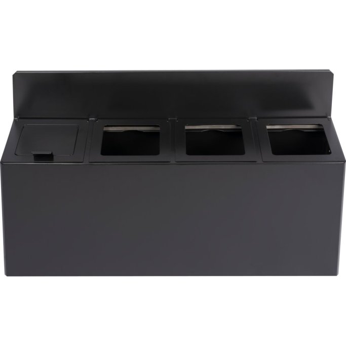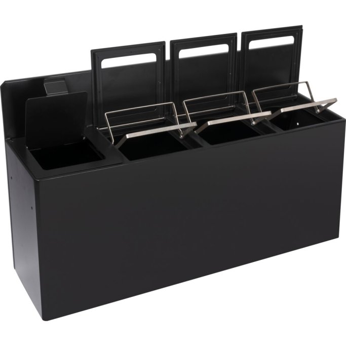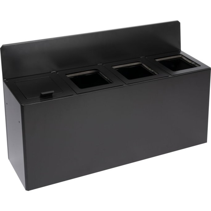This series of waste bins in black powder-coated steel is designed with a focus on flexibility and functionality. The bins can be adapted as needed and are available with 1, 2, 3 or 4 compartments - whether they are to be placed freely on the floor or mounted on the wall.